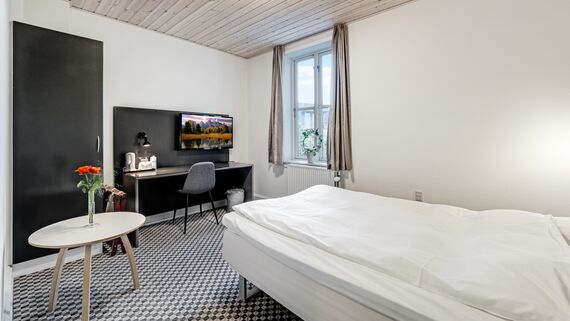 Vores hyggelige enkeltværelse giver en varm og indbydende atmosfære, perfekt til rejsende, der søger komfort og afslapning. Værelset er smagfuldt indrettet med enkeltseng, samt skrivebord med tilhørende stol. Fladskærms-tv’et på værelset sikrer, at du aldrig keder dig under dit ophold, her er mulighed for streaming via cromecast. Værelset har eget private bad og toilet, føntørrer og elkedel for din bekvemmelighed.