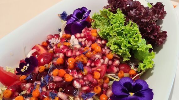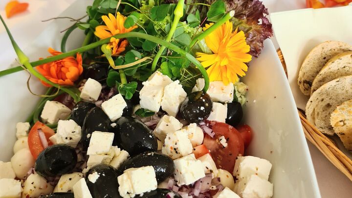 Traditionel salatbar med 5 slags grønsager og 2 dressinger.